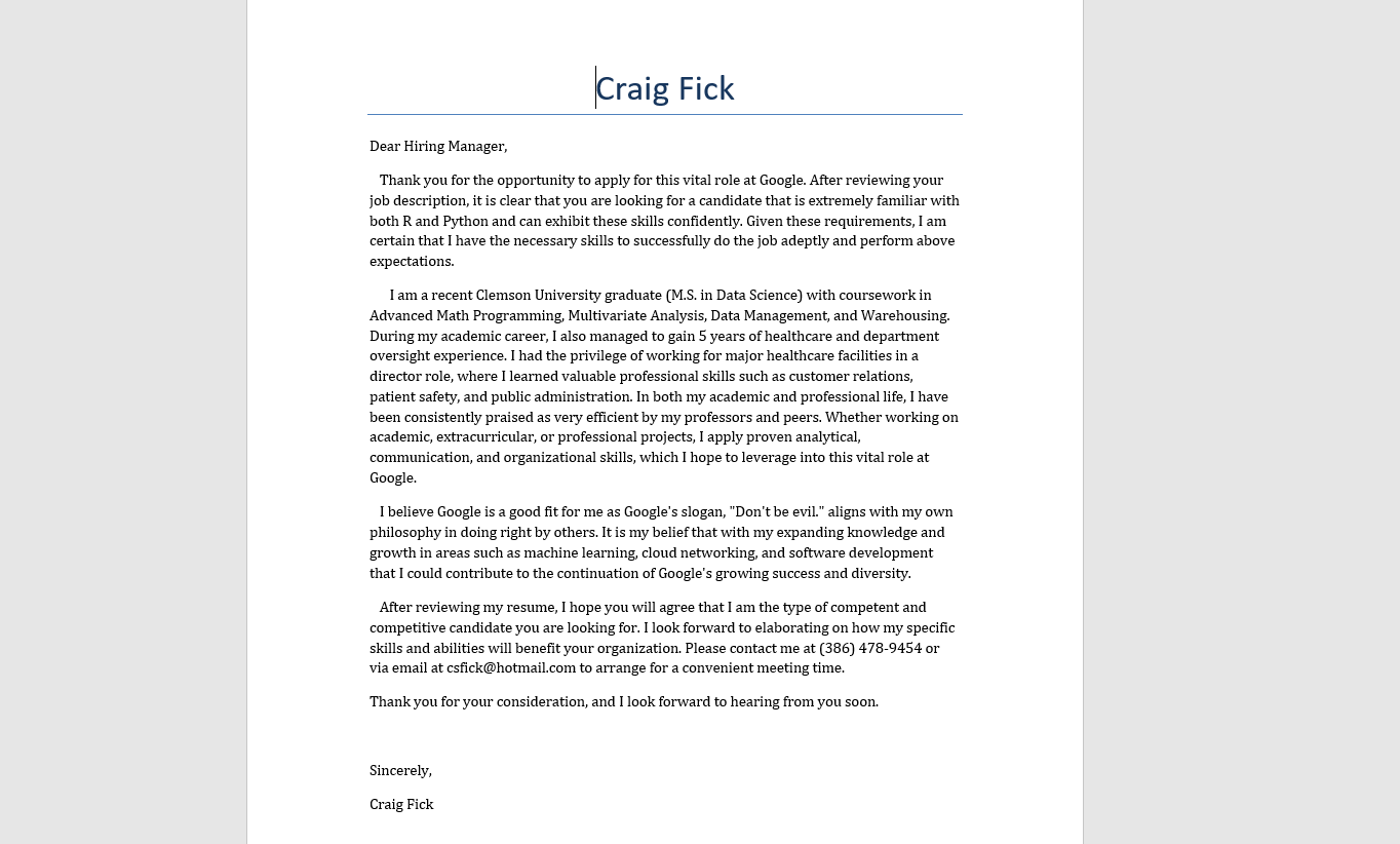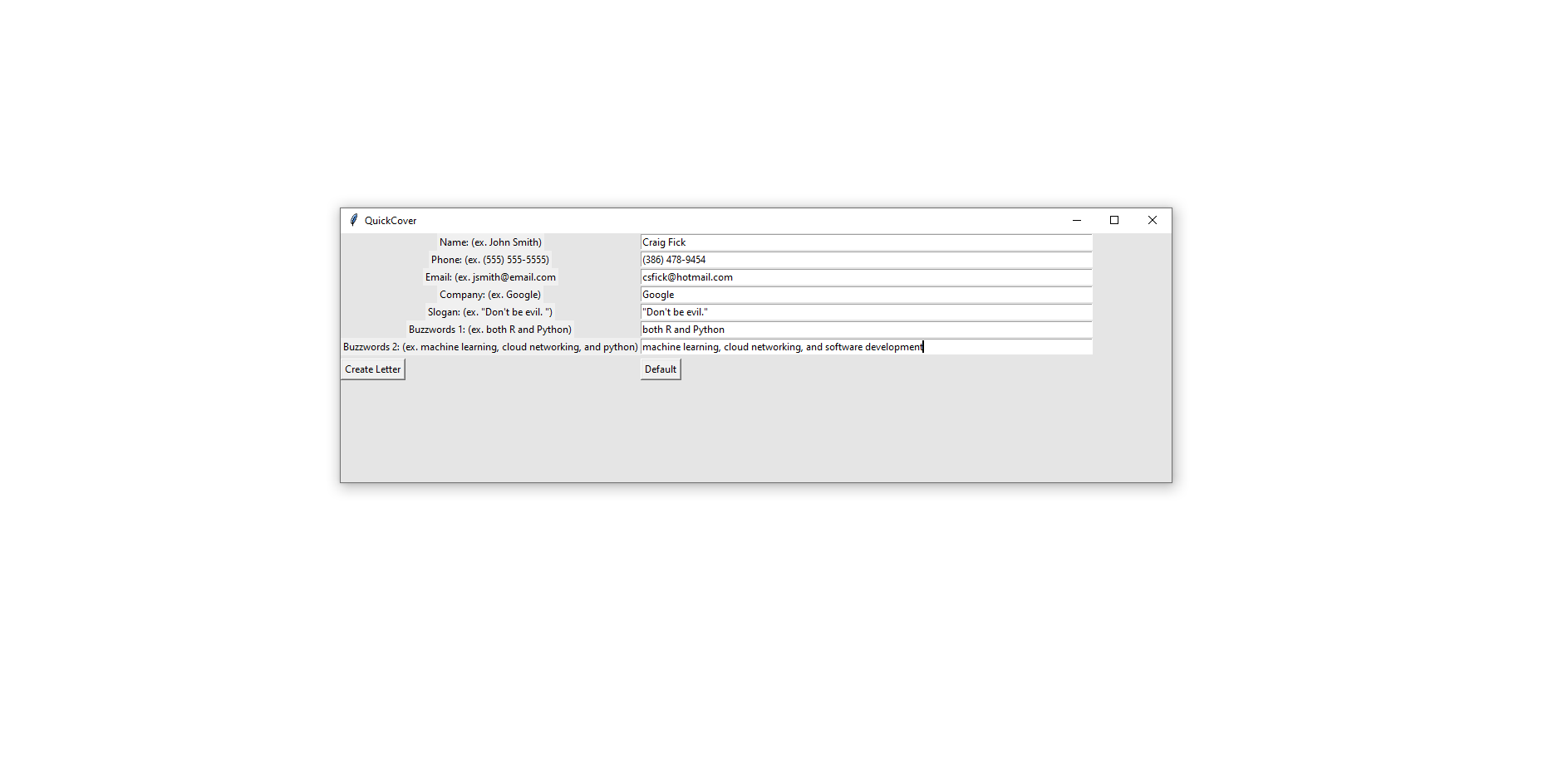 This project was created so I could manage to tailor a cover letter that was both personable and fast when applying for jobs. I don't think most people read them, but I think it is a nice touch if and when they do. The project is written in Python and is displayed in an easy-to-use GUI that lets users make quick adjustments. It also includes a default button in case you want to alter the code so you can populate your personal information without typing it every time you use it.