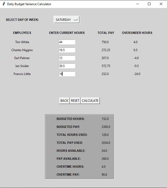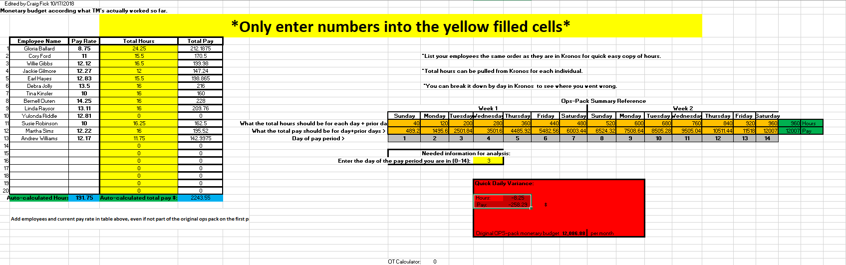 This tool allowed me to directly plug in the operations packet and calculate the hours and pay including overtime. There were several benefits to this. With this tool I could be updated quickly, prioritize who I would call in to stay under budget if I had a call-out, run overtime and stay under budget if I was under on hours, and avoid getting on budget calls with the COO at the end of the week.